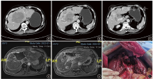 图1. 一例NETLM外科减瘤术前术后影像学检查及术中图像 注:a、b、c为术前增强CT,示肝内多发转移灶;d、e为术后增强MRI复查,示减瘤大部分病灶,剩余肝脏代偿增大;f为术后肝脏断面;NETLM为神经内分泌肿瘤肝转移